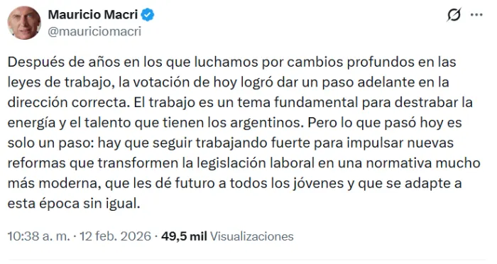 El ex mandatario, Mauricio Macri, se expresó en torno a la media sanción dictada por la Cámara de Senadores hacia la reforma laboral, que obtuvo 42 votos a favor y 30 en contra en una sesión maratónica y atravesada por un clima de manifestación frente a la plaza del Congreso.