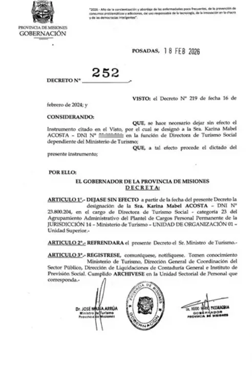 Si bien fue removida de su rol jerárquico —correspondiente a la categoría 23 del Agrupamiento Administrativo—, Acosta no dejará de pertenecer al Estado provincial. Al ser empleada de planta permanente del Ministerio de Turismo, continuará vinculada como trabajadora pública, aunque sin funciones directivas.