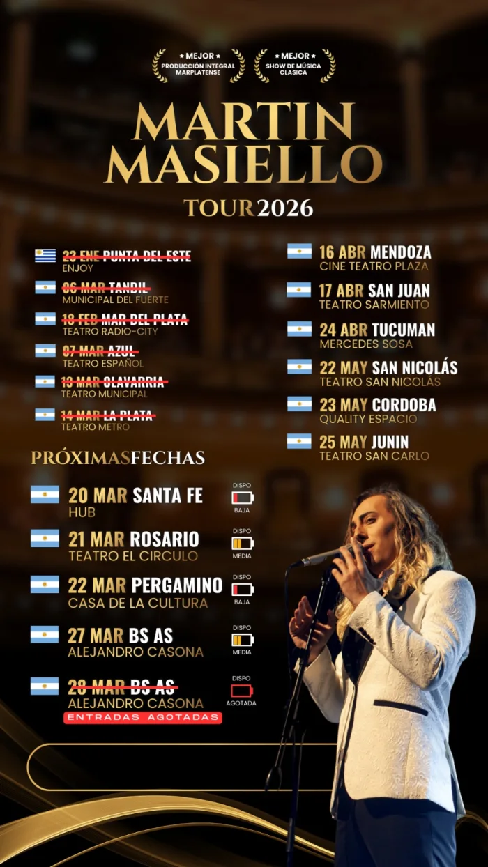 La escena lírica argentina actual presenta una de sus voces jóvenes con más impacto y resonancia en el mundo. Martín Masiello regresa a Buenos Aires con su nuevo show "Crescendo", un espectáculo que viene de ser distinguido con dos Premios Estrella de Mar 2026: Mejor Espectáculo de Música Clásica y Mejor Producción Marplatense.