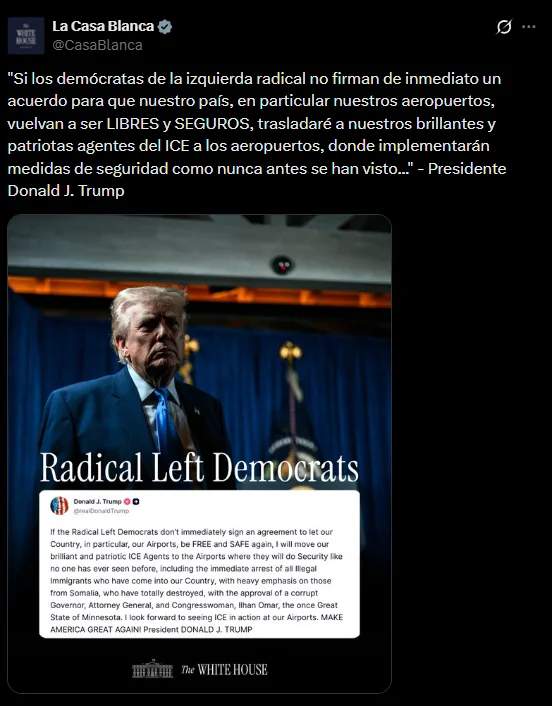 “Si los demócratas de la izquierda radical no firman de inmediato un acuerdo para que nuestros aeropuertos vuelvan a ser libres y seguros, trasladaré a nuestros agentes de ICE”, escribió el mandatario en su red social Truth Social.