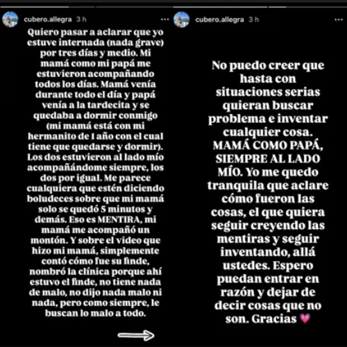 La menor también se manifestó en redes sociales y dejó en claro que tanto su madre como su padre estuvieron presentes durante su internación y aclaró que se sintió cuidada por ambos.