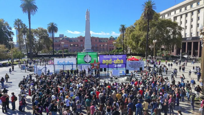 Docentes universitarios de la UBA dictan clases públicas este viernes frente a la Casa Rosada como medida de reclamo ante la falta de aplicación a la Ley de Financiamiento Univesitario por parte del Gobierno Nacional.