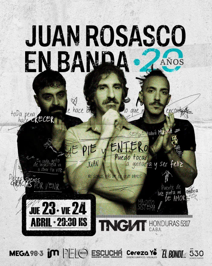 JUAN ROSASCO EN BANDA celebra sus 20 años de historia con dos shows en La Tangente (Honduras 5317, CABA) el jueves 23 y el viernes 24 de abril, con invitados muy especiales que forman parte de la historia del grupo. Entradas a la venta.