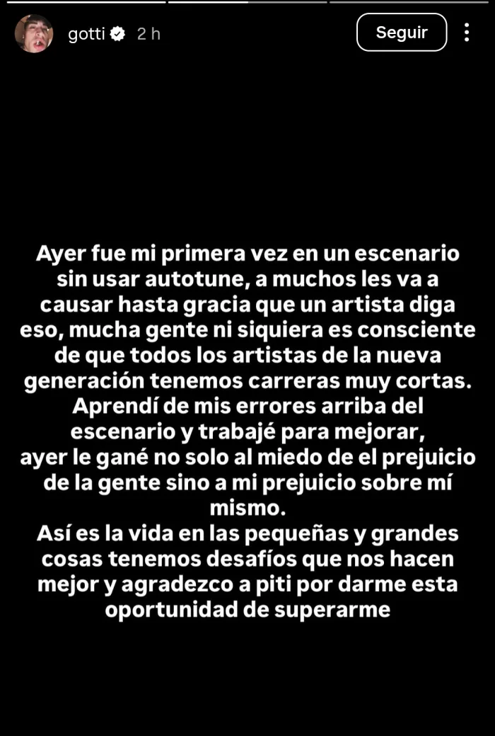 "Ayer fue mi primera vez en un escenario sin usar autotune, a muchos les va a causar hasta gracia que un artista diga eso, mucha gente ni siquiera es consciente de que todos los artistas de la nueva generación tenemos carreras muy cortas", comenzó el joven desde sus historias de Instagram.