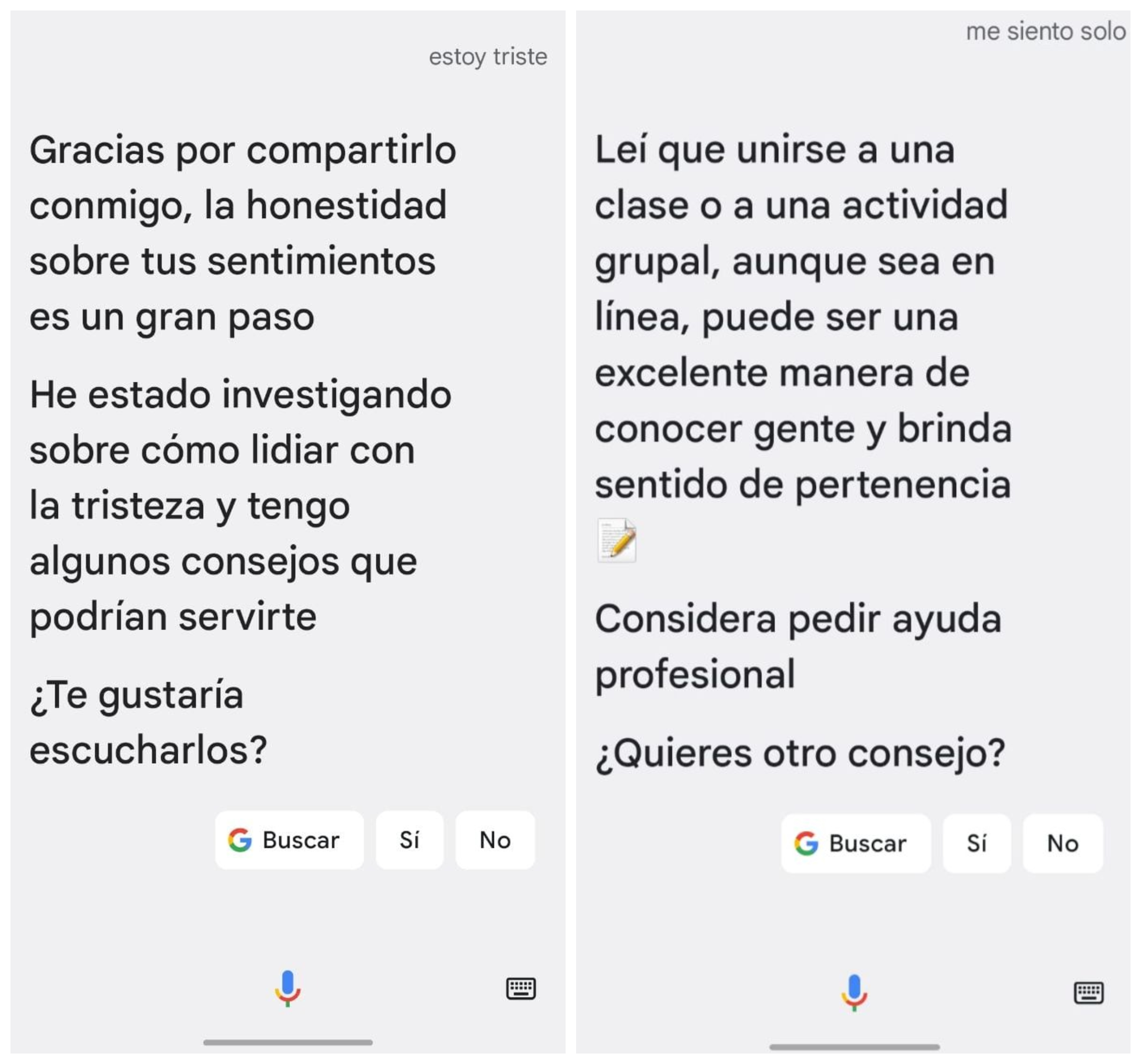 Google detectó que cada vez es mayor la cantidad de personas que buscan encontrar respuestas a través del Asistente de Google para sentirse mejor y obtener ayuda para afrontar la ansiedad y el sentimiento de soledad, principalmente a partir de la pandemia por Covid-19. En los países latinoamericanos que hablan español, desde septiembre de 2019 se ha duplicado el número de personas que le dicen al Asistente de Google que se sienten solos. En el mismo período, la cantidad de personas que les dicen al Asistente de Google que están tristes aumentó en un 25%.
