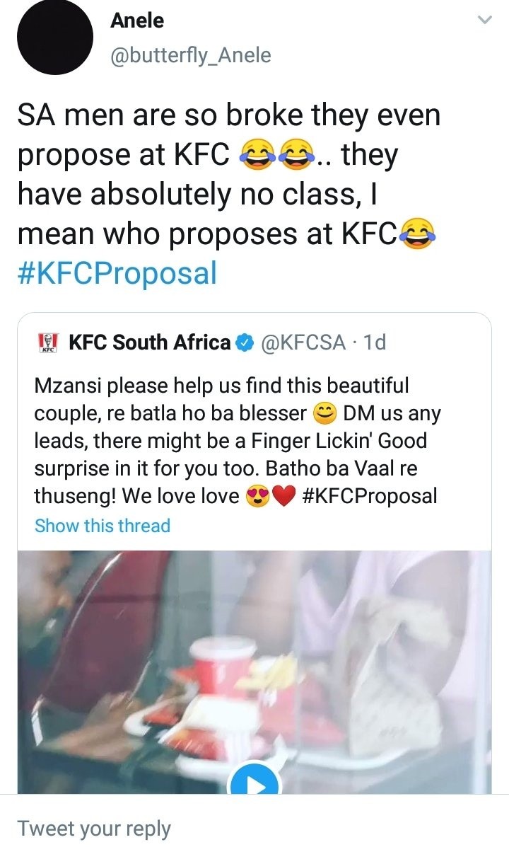 La conmovedora historia seguía sumando comentarios y los usuarios hicieron un esfuerzo para que KFC logre contactarlos, hasta que una joven escribió un despectivo comentario citando el video: "Los hombres sudafricanos están tan rotos que proponen matrimonio en KFC. No tienen nada de clase, es decir, ¿quién propone casamiento en KFC?", junto a emojis de caras llorando de la risa. Este comentario fue duramente criticado por algunos usuarios, aunque muchos otros coincidieron con la joven y comenzó un aluvión de burlas para la pareja.
